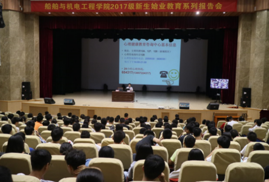 9月23日下午,船舶与机电工程学院2017级新生始业教育系列报告会在杨存国一号报告厅举行,校团委副书记姜伟和心理健康教育咨询中心主任杨盈应邀出席此次讲座,讲座由院党委副书记何晔主持。