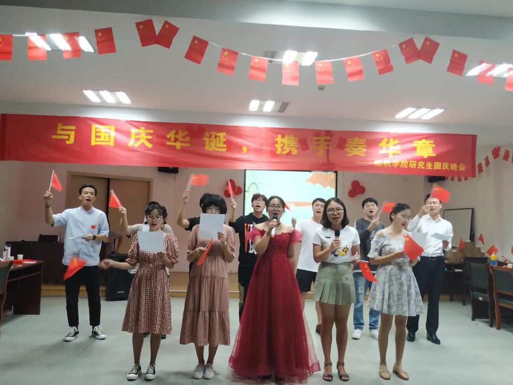 为迎接中华人民共和国成立70周年,充分展示研究生的才华,增强研究生集体的凝聚力,丰富研究生业余文化生活,陶冶研究生爱国主义情操。9月28日晚上,船舶与机电工程学院在工科楼119会议室举办“与国庆华诞,携手奏华章”研究生国庆晚会,出席本次晚会的有研究生工作相关的老师以及全体研究生。